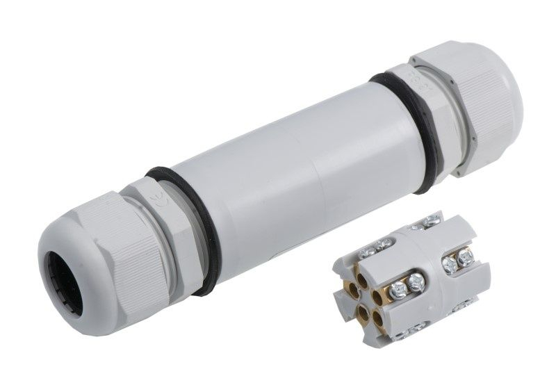 Conector etanș pentru cabluri electrice, potrivit pentru realizarea conexiunilor sigure în zone expuse la umezeală, praf și condiții dificile de lucru. Asigură o îmbinare stabilă și protejată, fiind recomandat pentru instalații electrice exterioare, aplicații industriale, iluminat ambiental și conexiuni temporare în șantiere sau ateliere.