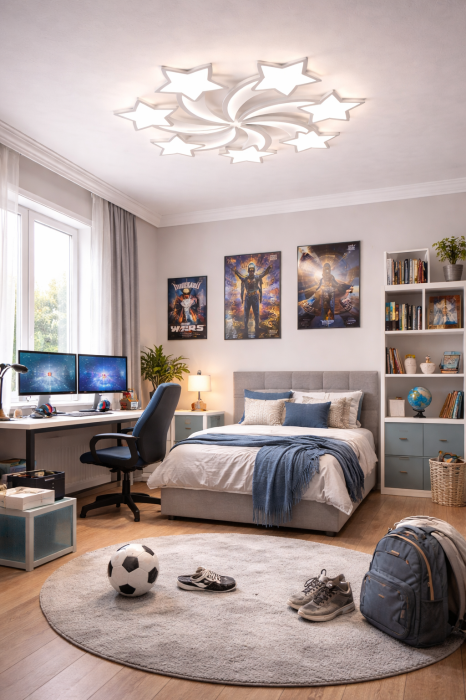 Este realizată din metal și acrilic, cu finisaj alb. Dimensiunile sunt de 760 x 760 x 95 mm, iar gradul de protecție IP20 indică utilizarea în interior. Se potrivește pentru dormitor copii sau camere de adolescenți. Imaginea de prezentare este orientativă și nu reflectă proporțiile reale.