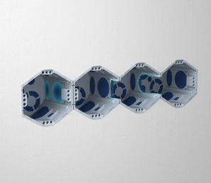 Cu 4 x 3 domuri de șurub și 2 câmpuri de clemă expandabile, doza permite multiple combinații laterale, respectând distanța standardizată de 71 mm. Intrările pentru cabluri și conducte sunt complet fără scule, atât pe circumferința dozei, cât și în partea de jos, ceea ce facilitează organizarea rapidă și eficientă a cablurilor.