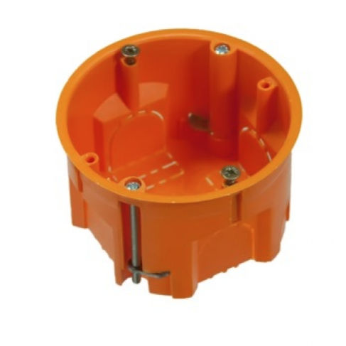 Construcția este realizată din plastic portocaliu durabil, cu formă rotundă, pentru o instalare ușoară și rezistentă. Doza este prevăzută cu intrări multiple pentru cabluri și tuburi, inclusiv din spate, permițând flexibilitate în configurarea circuitelor electrice. Fixarea aparatajului se face cu șuruburi sau prin prindere expandabilă, iar doza include cleme pentru rigips și tab-uri pentru cabluri.