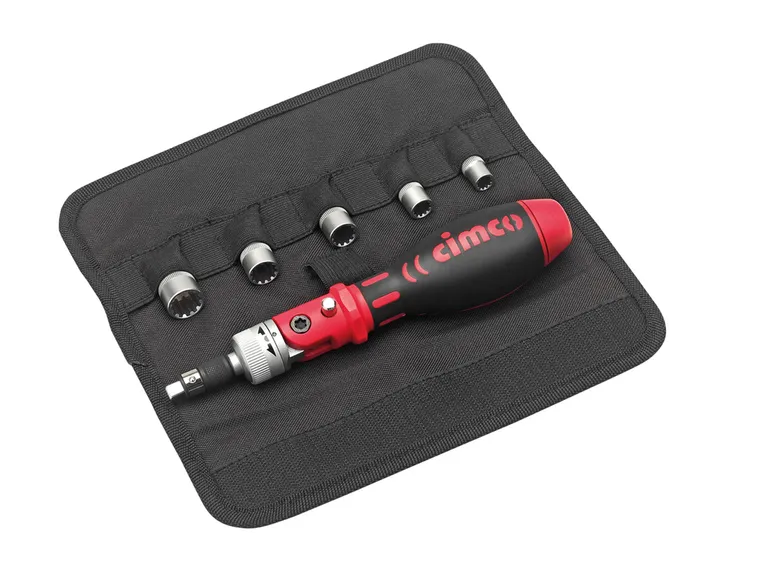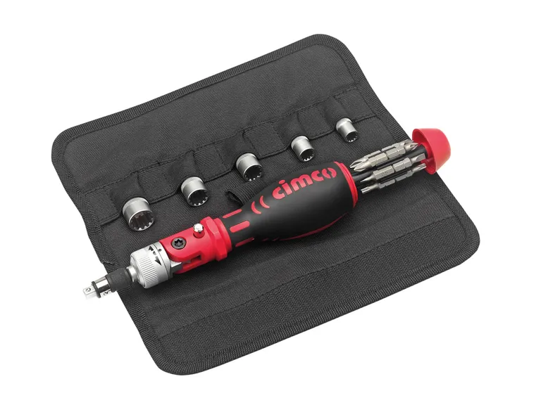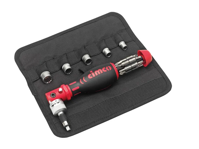 Setul de 18 șurubelnițe cu clichet CIMCO este conceput pentru strângerea și slăbirea rapidă a șuruburilor, cu rotație stânga/dreapta liber selectabilă și un unghi de lucru reglabil în 3 poziții: 0°, 45° sau 90°. Atașamentul combinat permite folosirea atât a biților hexagonali standard, cât și a cheilor cu pătrat prin simpla ajustare a mandrinei. Mânerul ergonomic 2 componente asigură lucru fără alunecare și fără oboseală. Biții și adaptoarele sunt depozitați sigur în mâner, iar setul include și o husă tip rolă pentru transport.